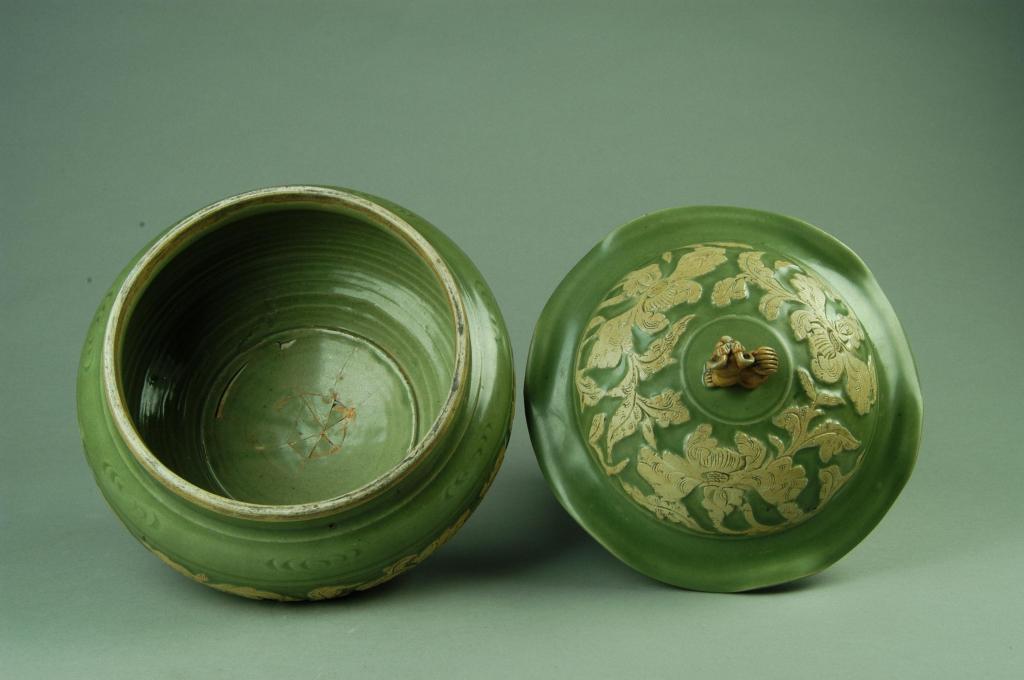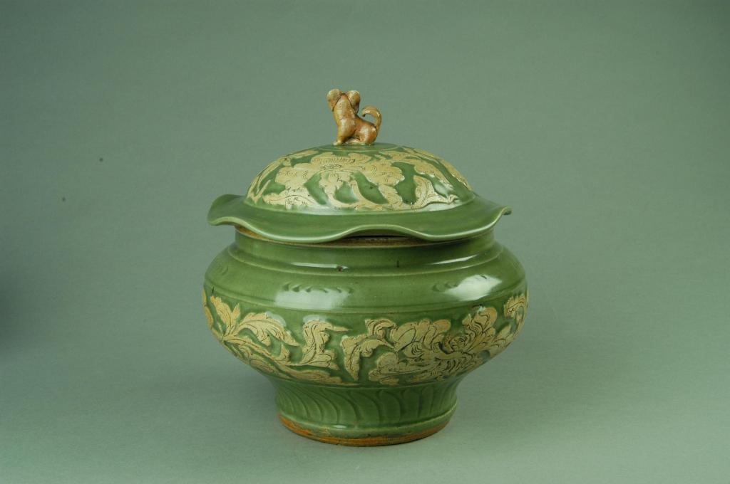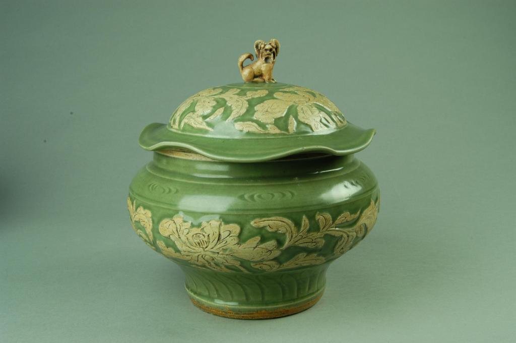 龙泉窑青釉折枝牡丹纹瓷盖罐