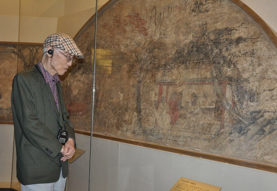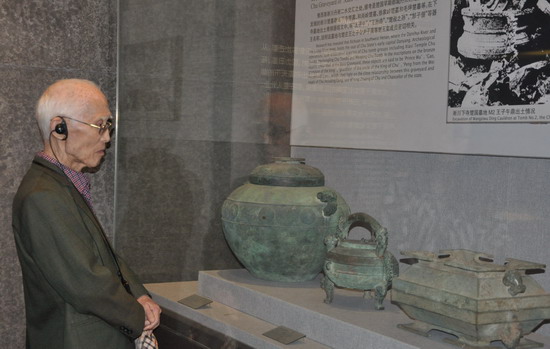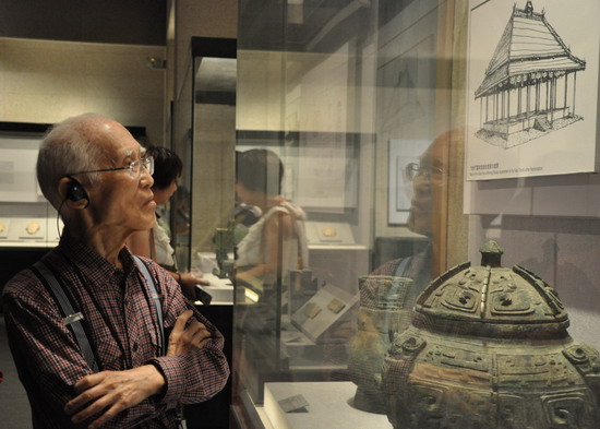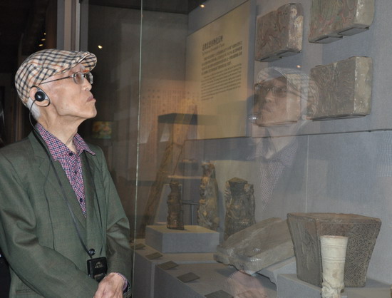 台湾著名诗人余光中被精美的文物吸引,陷入深深地沉思