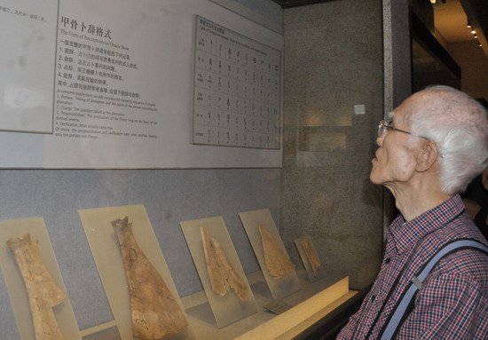 86岁高龄的余光中一行参观了河南博物院的基本陈列“中原文明之光”八个展厅。从仰韶文化的骨笛到西周的青铜器上的纹饰,从汉代的建筑明器再到宋元时期的精美瓷器,余光中先生沿着展厅的展线一路走来,边听讲解边思考,细细的审视着陈展的文物、仔细地看文物的说明,许多次的陷入深深地沉思中。参观过程中,余光中向河南博物院副院长李宏了解文物外展、考古发掘等方面的情况,李宏都一一详细的解答。三个小时的参观,余光中先生一直徜徉在中原历史绵绵长河中,感受文化的源远流长。