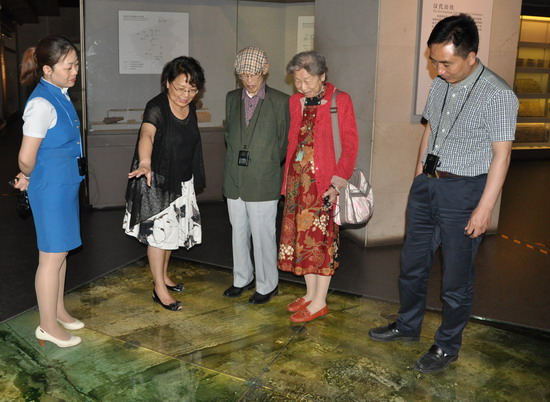 河南博物院副院长李宏(左二)向余光中(中)介绍安阳三杨庄汉代遗址的发掘情况