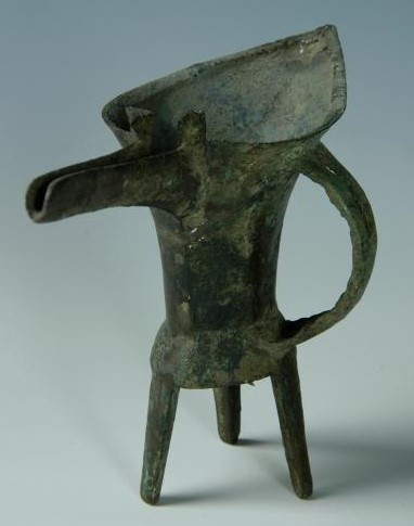 The Jue has a thin spout at the front like a beak, a tail at theback and slender legs below the belly. Two small pillars are on thespout. It is one of the earliest bronze containers in China sofar.