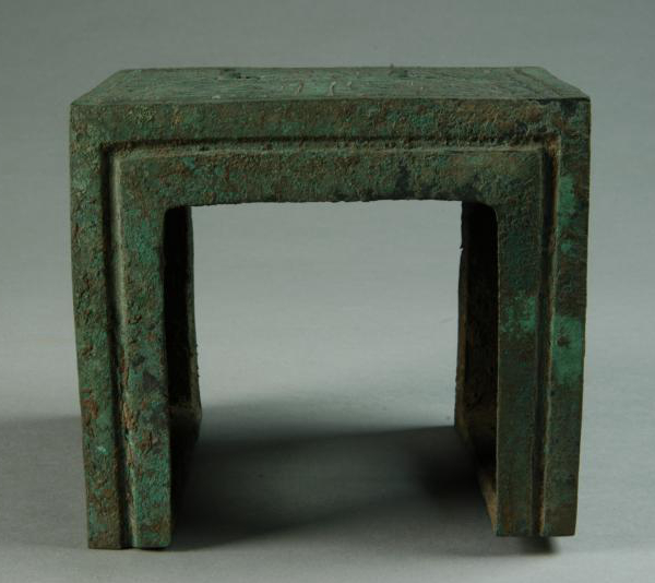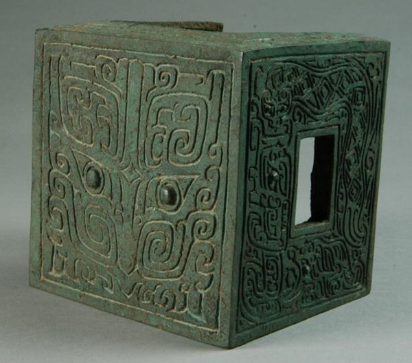 The frontal side of this object is almost square, if one overlooks its slightly concave shape, and there are rectangular holes in each of its two sides. The frontal side is decorated with single incised line taotie patterns, while the rectangular holes are encircled with depictions of dragons and tigers in combat. Further to its exquisite decorations, the modelling of this decorative piece is unique; it is the earliest bronze building component to have been discovered in China. It was likely a decorative object, one of which would be placed at either end of a wooden beam in the palace, where It also served to reinforce the structural stability. The clearly visible and quite beautiful taotie designs also illustrate the aesthetic tastes of the Shang artisans.