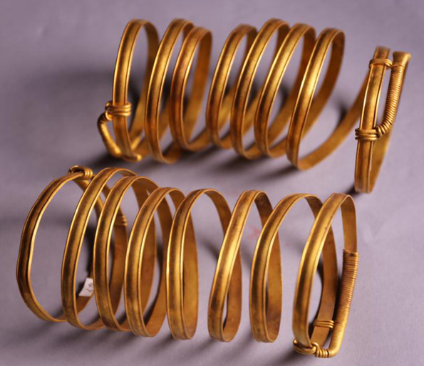 Bichuan armlets are also known as tiaotuo armlets (there are two different names for tiaotuo armlets with different tiao characters跳脱and条脱) They are made by hammering strands of gold and silver flat, and then winding these strands into a coiled armlet or bracelet. They have at least three coils, some with five, eight or over ten. Given that a human arm becomes thinner towards the wrist, the coils are arranged in decreasing size order. The two ends of the armlet are made of fixed gold and silver strands, but the intervals between them can be loosened or tightened. Gold armlets were already in use during the Shang dynasty.
