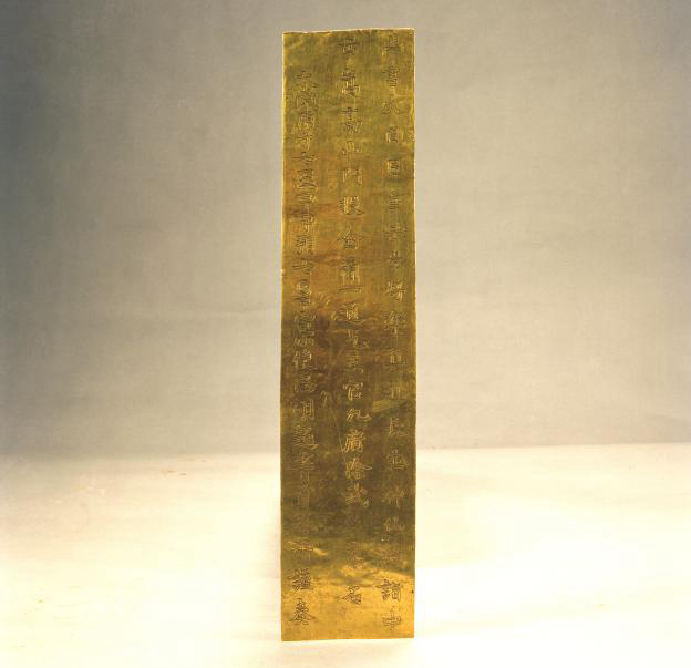 This gold slip for absolving sinwas discovered in the northern side of Junji Peak of Mount Songshanin Dengfeng County, Henan Province in 1982. It was given to herentourage by Empress Wu Zetian who was the only empress in China asa written message for absolving sin when she visited Mount Songshanin AD 700.