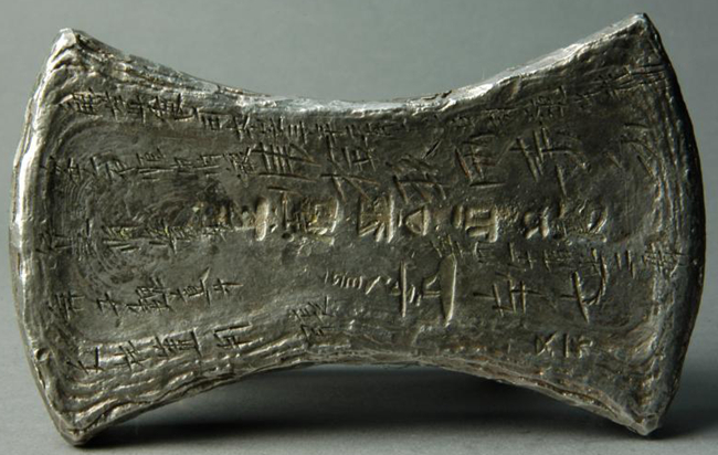 The Shihuozhi Jishi (Food section, History of the Jin dynasty) records that the Jie salt is produced in Jiezhou and Anyi in Shanxi. This silver ingot was used as a part of the system of salt control under the Jin dynasty, which established a bureau for Jie salt. On the 12th day of the 2nd month of the 12th year of the Da'an reign period this ingot was cast from salt tax revenues, as a form of officially sanctioned silver.