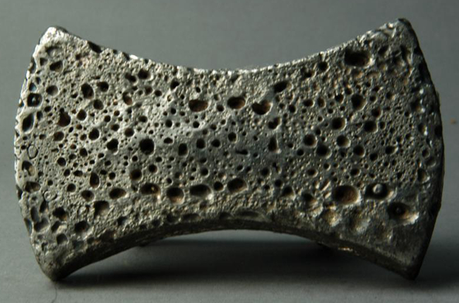 This ingot is flat on both sides, with two arched ends and a pinched midsection. The inner section of the front face is slightly concave, with wave patterns around its border. There are inscribed characters at either end of the ingot and around its edge. The middle of the ingot has a relatively deep stamp impression. The inscribed text runs from right to left. The middle of the reverse face is slightly convex. The sides and the rear face of the ingot are honeycomb-shaped around the edge.