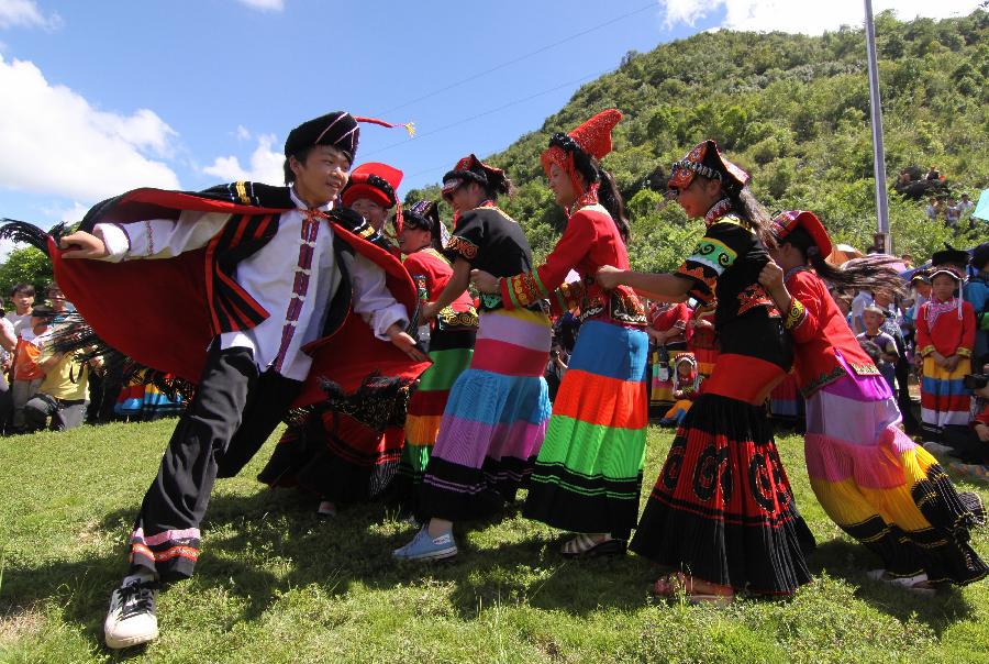 Youths of the Yi ethnic group attend an activity celebrating the Torch Festival in Baoshang village of Longlin autonomous county of all nationalities, Southwest China's Guangxi Zhuang autonomous region, July 31, 2013. The Torch Festival, which falls around the 24th day of the sixth Chinese lunar month every year, is the traditional holiday of the Yi ethnic group.