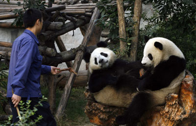 A pair of giant pandas eats bamboo shoots offered by a feeder at Chengdu Research Base of Giant Panda Breeding in Chengdu, Southwest China's Sichuan Province November 13, 2006. Pandas can enjoy their favorite food in the early winter due to warm weather this year.
