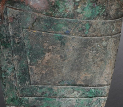 Among them there is a bronze gui. With an overall height of 17 centimeters, it has a slightly flared mouth with circular rim, a slightly slanting belly, and a relatively high ring foot. On the bottom of the container, the inscription of the character xi can be found.