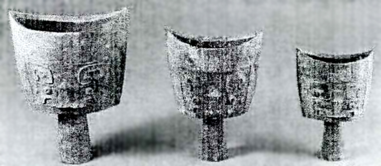 There is also a bronze jue (wine vessel). With an overall height of 15.5 centimeters, it has a spout in the front and a tail at the back. The mouth is flanked by a pair of posts in symmetry. It has a round bottom and a handle. The inscription of the Chinese character xi is also found on the interior wall of the handle.