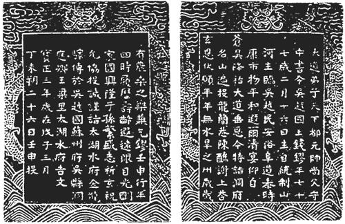 The first one was cast to Gaoli, Dongting Township, Wuxian County, Suzhou Prefecture (Fig. 4). Found in Emperor Shunzhi’s reign of the Qing Dynasty, it measures 20cm long and 13.1cm wide, and is engraved with wave pattern in the lower part and dragon-in-clouds pattern on both sides and in the upper part. Within the frame, there are 279 characters. The second one was a jade slip cast to Wangliangli, Dongting Township, Wuxian County, Suzhou Prefecture of Wuyue Kingdom (Fig. 5). Its length-to-width ratio is similar to that of the above-mentioned silver slip, and the patterns are the same. On both its front and back sides there are 188 characters. The third one was cast to a certain prefecture/county/town of Wuyue Kingdom (Fig. 6). Measuring 31cm long and 6.7cm wide, it is plain but is engraved with 194 characters. The name of the prefecture/county/town remains blank, and it is possible that the name would be engraved on the slip when the specific location is decided. Among these three slips, the former two are similar in shape and pattern, and the latter one is distinctively different from them. Instead, it is similar to the one cast by Qian Liu at the age of 62.