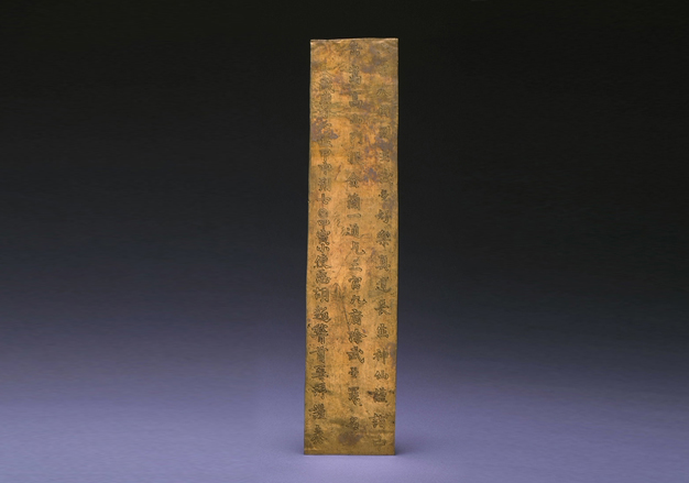 Bamboo(wooden) Slip, a kind of material used by ancient people for recording, was popular in the Warring States Period, Qin and Han Dynasties. Later with the invention of paper, the slip gradually lost its original function. With the rising of Taoism in the Eastern Han Dynasty, the function of slip was changed and it was often used in Taoist events. According to differences in function, slip was also called Zha, Ban, Ye, Ci, Quan in Chinese. There were mainly four functions. Firstly, the periapt to ward off evil spirits or cure diseases; secondly, visiting card devoted to Earth Deity; thirdly, a human-shaped slip for the exercise of eliminating disasters; fourthly, the land purchase certificate in the tomb chamber. The Gold Slip of Wu Zetian is the only one made of gold so far discovered in China. According to the records in Annals of Kuaiji in Jiatai Period, “Yuan Zhen, a governor of the Tang Dynasty, cast a gold slip in Yangming Cave on Spring Equinox”. It indicates that there used to other gold slips in history.