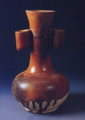 In 1972, the reddish-yellow glazed pitch-pot with twin handles [14], 35 cm high and dating from the Tang Dynasty, was unearthed from the tomb of Li Zhen, the Prince of Yue of Tang, in Liquan County, Shaanxi Province.