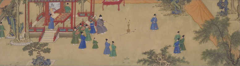 In the picture of Emperor Xuanzong Seeking Pleasure [16] of the Ming Dynasty in the collection of the Palace Museum, a section was dedicated to representing Zhu Zhanji, Emperor Xuanzong of the Ming Dynasty, who was playing the game of pitch-pot with his ministers.
