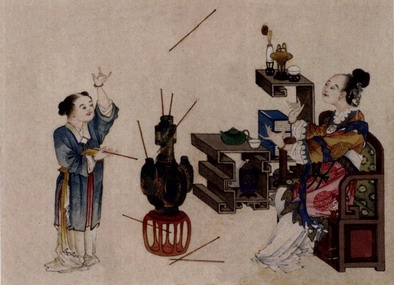 The Painting Album of Beautiful Women in Entertainment • The Game of Pitch-pot (color on paper ) [18] painted by Yu Lan in the Qing Dynasty and with a height of 16.8 cm and a width of 22.7 cm, is now in the collection of the Palace Museum.