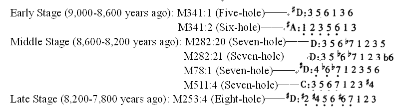 Twenty-two bone flutes were unearthed form 15 tombs of the Jiahu site. By abundance of burial objects, they may be classified as belonging to three stages—the Early Stage (approximately 9,000-86,00 years ago): the flutes have 5 or 6 holes and may produce sounds of four or five tones; the Middle Stage (approximately 8,600-8,200 years ago): the flutes have seven holes and may produce sounds of six or seven tones; and the Late Stage (approximately 8,200-7,800 years ago): the flutes have seven or eight holes and may produce sounds of seven tones as well as of altered tones.
