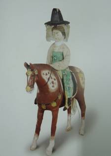 Fig. 8 Tricolored figurine of a woman wearing a Weimao hat and riding a horse (unearthed from Astana of Turpan in Xinjiang in 1973)