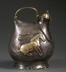 Fig. 11 Thesilver flask with dancing horses holding cups in their mouths (unearthed from Hejia Village in the southern suburb of Xi’anin 1970)