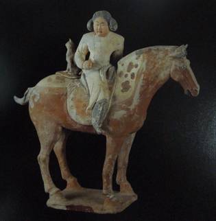 Fig. 12 Figurine of a woman hunting with a lynx and riding a horse (unearthed from the main tomb chamber ofJinxiang of the Tang Dynasty at Huokou in the east suburb of Xi’an, Shaanxi Province in 1992)