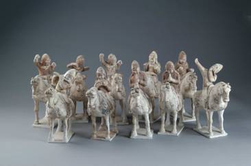 Fig. 13 Ten painted figurines of musicians performing on horses (unearthed from the tomb of Liu Kai, magistrate of Dingcheng in Guangzhou of the Tang Dynasty, and his wife, in Yanshi in 1984)