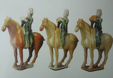 Fig. 14 Three tricolored figurines of musicians performing on horses (unearthed from Luoyang, Henan Province, in 1954)