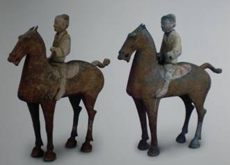 Fig. 27 Pottery figurines of warriors on horses (Northern Wei Dynasty, height: 38.5cm and 37.4cm respectively, length of horse: 34.5cm, unearthed from Caochangpo, Xi’an, Shaanxi Province, in 1953)