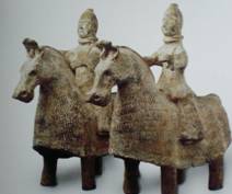 7. Performing on horses. The painted figurines of musicians performing on horses (Fig. 13) unearthed from the tomb of Liu Kai and his wife in Yanshi and those in the collection of Henan Museum (Fig. 14) show different styles.