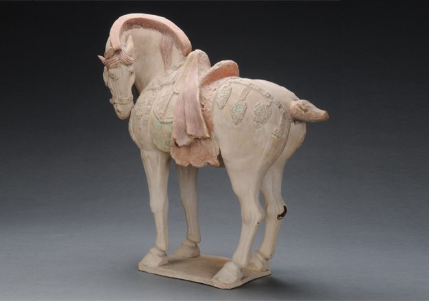 The horse has a bridle on the head and a bit in the mouth. Its cheeks are flanked by Xingye. Its eye sockets are outlined with ink. The front mane on the head is loosely divided into several sections, and the mane on the neck and back is well trimmed. On its back there is a saddle and the screens, the former covered with Anfu. Both the girth and rear strap are decorated with Xingye. The saddle and mane are painted red, and Xingye, green. Made of white clay pottery, it is molded and stands on a rectangular plate. A rare masterpiece of pottery horses of the Tang Dynasty, it shows the superb skill of artists of pottery sculpture then, and provides a physical material for the study of pottery art and funerals of the Tang Dynasty.