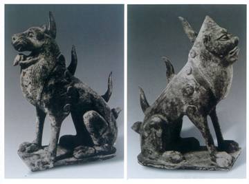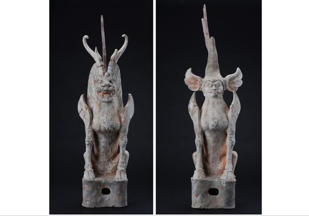 Fig.9 A pair of grey-pottery tomb-guarding beasts unearthed from Yuan Shao’s tomb of the Northern Wei Dynasty in Luoyang, Henan Province