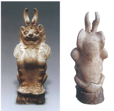 2. A pair of pigmented pottery tomb-guarding beasts unearthed from Gongyi Food Products Factory, Henan Province: The lion-faced beast has two straight horns on its crown. The halberd-shape ornament is wide and thick. Tooth-shape wings grow out of the beast’s shoulders. The 62.4cm-high beast crouches high on a pedestal, its mouth wide open and eyes bulging. It looks simply magnificent, despite the peeling paint. The human-faced beast has one wide and flat horn and three smaller horns on its crown. Its protruding ears are extraordinarily wide and its wings in the shape of palms. This beast takes a same posture as its counterpart does. This round-eyed high-nosed figurine looks much more powerful than the human-faced beasts before it. The beast measures 65.2cm high (Fig.12).