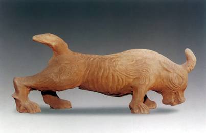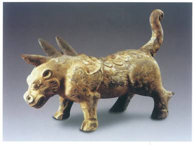 The earthenware tomb-guarding beast unearthed from No.34 Tomb of the Western Jin Dynasty in Xingyuan, Yanshi, Henan Province: The bull-like beast looks like a dog at the head and tail. Three halberd-shape horns stick out at the neck, short wings grow out of the shoulders and feathers grow on its back. The strong beast is ferocious-looking and looks as if it is walking and seeking food. It measures 34.5cm long and 23.7cm high (Fig.8).