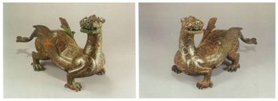 Fig.7 Two pairs of silver-inlaid copper winged tomb-guarding beast unearthed from the tomb of King of Zhongshan kingdom in Pingshan, Hebei Province