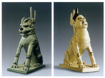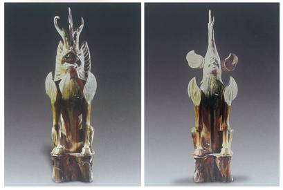 Fig.12 A pair of pigmented pottery tomb-guarding beasts unearthed from Gongyi Food Products Factory, Henan Province