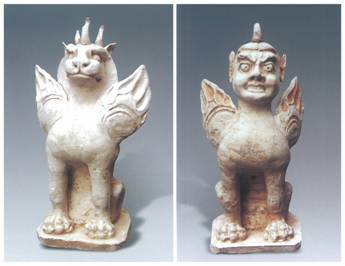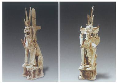1. A pair of earthenware tomb-guarding beasts unearthed from Yuan Shao’s tomb of the Northern Wei Dynasty in Luoyang, Henan Province: Both the lion-faced and the human-faced tomb-guarding beasts hold their heads and chests high. Each has three groups of mane on the back. The short tail turns upwards. Feathered wings grow on its shoulders and long mane around the neck. Each beast seats on a rectangular board, the front legs straight. The 25.5cm-high lion-faced tomb-guarding beast opens its mouth wide and sticks its tongue out. The human-faced beast is also 25.5cm high. Short horned, it has protruding nose and mouth. From the Northern Wei Dynasty, the number of tomb-guarding beasts in a tomb increased from one to two, and stylized thereafter (Fig.9).
