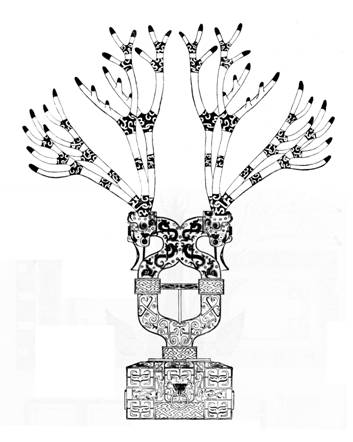 2. A wooden tomb-guarding beast unearthed from the Chu tomb in Tianxing Taoist Temple, Jiangling, Hubei Province: Two beasts sit back to back, looking outwards. The neck and the tail merge into one and stick into the square base. Each beast has deer antlers on the head and its long tongue sticks out. It is entirely coated with black lacquer, painted with beast-face, kui, cloud and diamond patterns in red, yellow and gold. The piece is 170cm high (Fig.6).