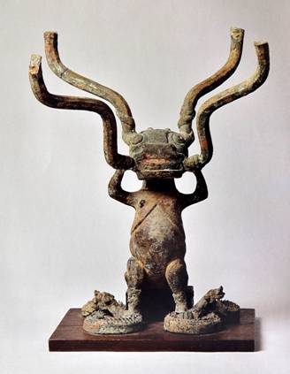 1. Human-shaped tomb-guarding beast unearthed from the Tomb of Duke of Zheng dating back to the mid-Spring and Autumn Period in Lijialou, Xinzheng, Henan Province: The seated beast has two coiling snakes tramped underneath each foot. Its belly protrudes and there are nipples on its chest. A big head is on the strong neck. It holds two curved poles in the mouth and other two extend behind its head, in the imitation of deer antlers. The tomb-guarding beast measures 47cm high, 34cm long and 30cm wide (Fig.5).