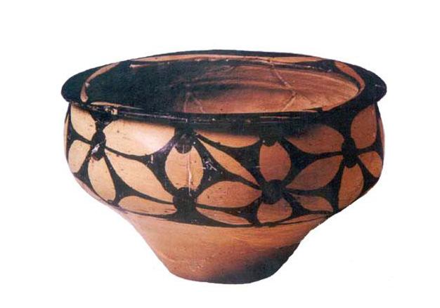 The pottery bowl painted with petal patterns of the Dawenkou Culture measures 10.0cm high and 16.5cm wide in diameter at the mouth. Unearthed in 1963 at Dadunzi in the Pixian County, Jiangsu Province, the bowl is now in the collection of Nanjing Museum. (Fig.6) The smooth-lined petal patterns on this bowl are mostly in multiple colors, instead of being in a single color, thus of a distinctive beauty.