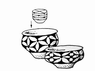 Aesthetically, patterns and colors are the priority for the craftsmen in making the pottery basins. The petal patterns on this pottery basin were evolved from geometric patterns. Originally designed in accordance with the layout of the basin, the patterns are arranged in a way that the outer surface of the basin wall is divided into 4-8 portions. The mouth and outer surface of the wall is first divided into quarters by way of cross segmentation. Each quarter is then further divided into eight triangles totally the same by drawing “米”-shape lines on it. (Fig.1)