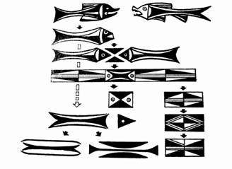 Fig.4 How realistic-style fish patterns were evolved into abstract geometric ones