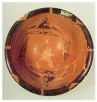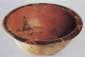 The basin painted with human-faced fish patterns is a Banpo Type vessel of the Yangshao Culture and measures 17.0cm in height and 41.5cm wide in diameter at the mouth. Unearthed in 1979 in the Jiangzhai Village of the Lintong County, Shaanxi Province, it is now in the collection of Xi’an Banpo Museum. (Fig.5) The patterns are painted on the lip and inner surface of the wall of this flat-bottomed basin. Many archaeologists believed that the mysterious-looking human-faced fish patterns must have something to do with the primitive faith of the Banpo Clans.
