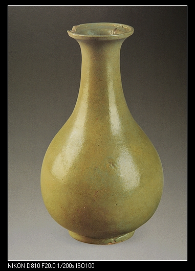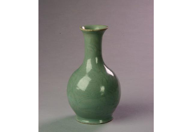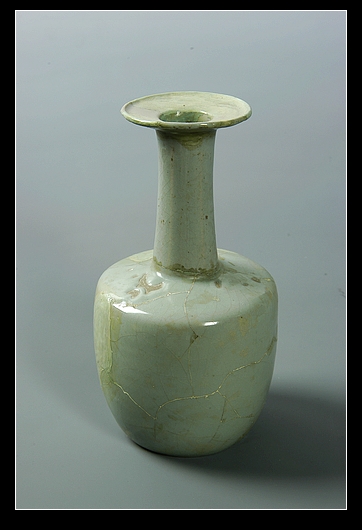 Powder green-glazed vase with bent shoulder (Fig. 7), height 23.6 cm, diameter of dish-shaped mouth 8.4 cm, base diameter 8.5 cm.