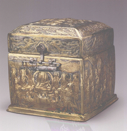The gilded silver Sarira casket with a Luding-style cover and scene of Buddha expounding doctrine on the front side (Figure 5). It is the fifth of the eight-layer nested caskets.