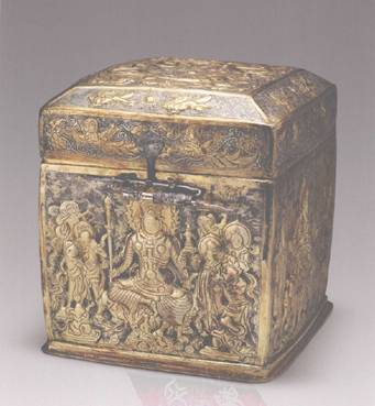 The gold Sarira casket with six-arm Avalokitesvara design (figure 6). The top cover is embossed with two confronted flying phoenix. The facade is embossed with six-arm Avalokitesvara. It is the fourth of the eight-layer nested caskets.