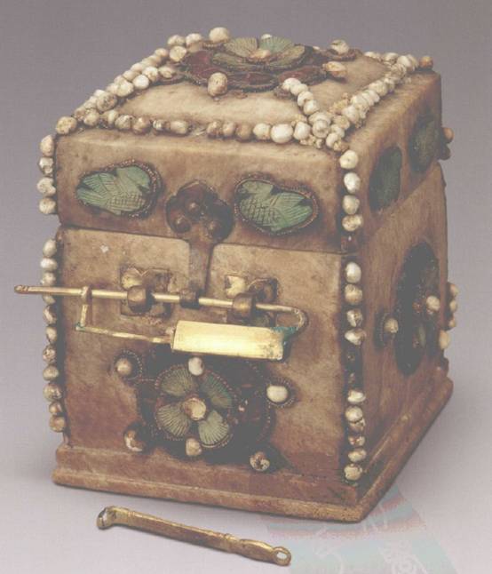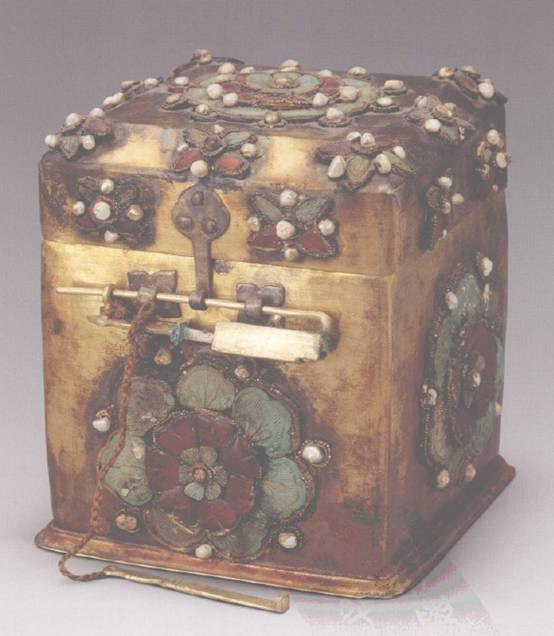 The gold Sarira casket with gold frame design inlaid with pearls and jade-like stones (figure 8) . The casket is fully embellished with pearls and gems. It is the second one of the eight-layer nested caskets.