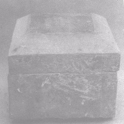 In 1988, a square stone casket was excavated from the Pagoda crypt in Fusheng Temple of the Song Dynasty, in Dengzhou City (figure 12) . It was found on the groove of the stone base which is in a xumizuo-style. The top cover of the casket is in shape of a pyramid. The joint part of the cover to the body is smaller and can be inserted into the body.