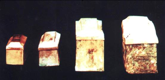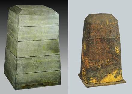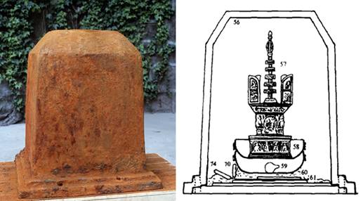 In 1956, a stone casket and an iron one were discovered in the square case of the third floor in Huqiu Pagoda, Suzhou City (figure 13) . The iron casket was nested in the stone one.