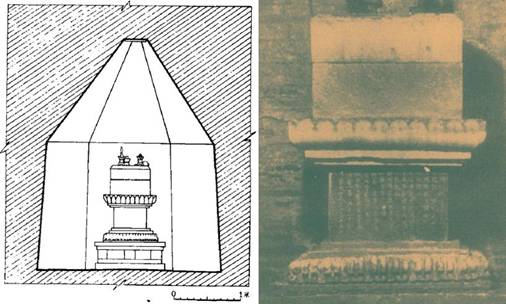 Figure 12 The cross-section of the pagoda crypt under the pagoda pedestal and the square stone casket excavated from the crypt in Fusheng Temple
