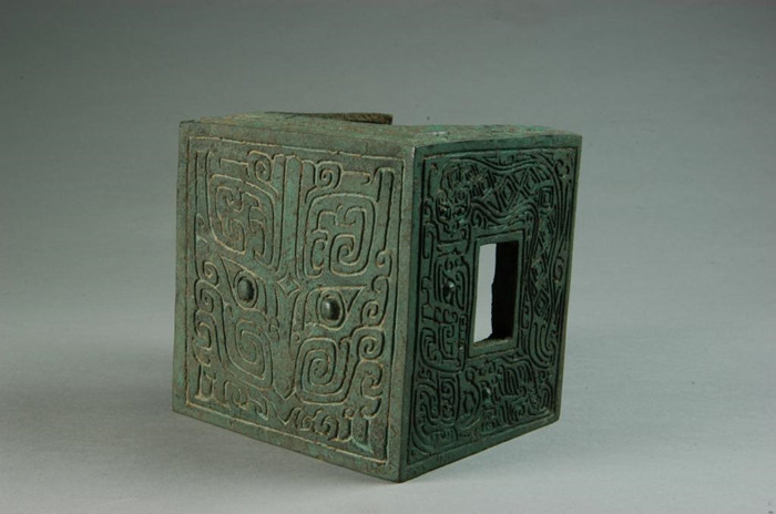 器物正面为单线阴刻兽面纹,两侧长方形孔周围纹饰近同,皆为龙虎搏象图。装饰整体布局结构严谨、纹饰线条精致细腻,既有庄重之感,又不失威严之气,是我国目前发现最早的青铜建筑构件。它既是宫殿木梁前段的装饰,也是加固木梁的构件,显示出商王宫殿的奢华气派。