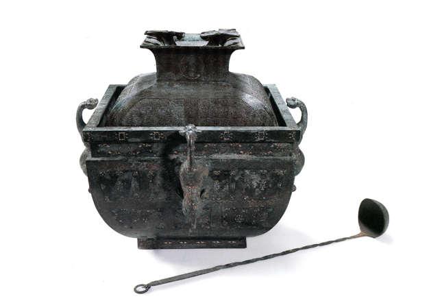 3-49嵌松石兽耳铜方鉴与错银髹漆蟠螭纹铜方罍(附勺)