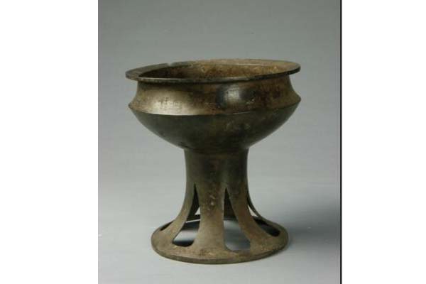 豆为盛食器,该豆造型别致,敛口,宽折沿,折肩,腹壁内收至圈底,下有带三角形大镂空的喇叭状足。通体素面无纹,但光洁无锈。束颈处有铭文1行15字:“黄君孟自乍(作)行器,子子孙孙则永宝宝”。